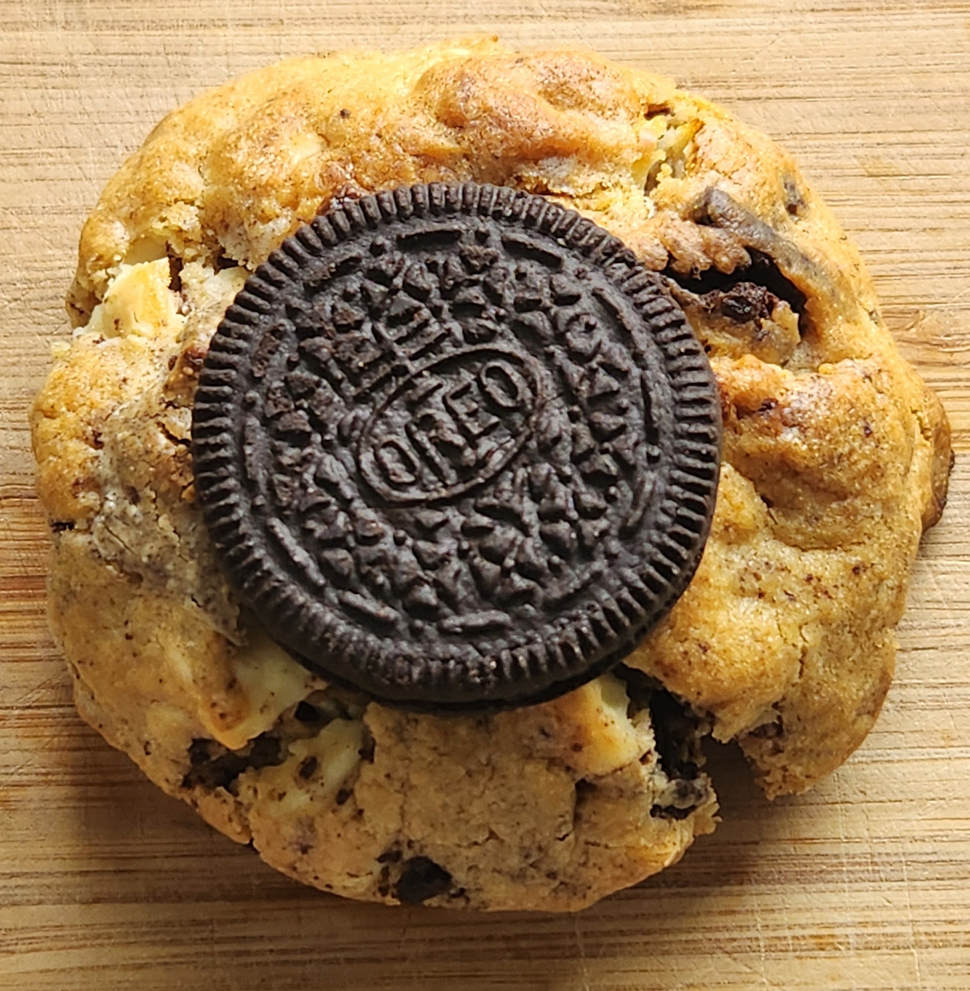 La combinaison d'une pâte vanille généreusement garnie de chocolat blanc, de morceaux d'Oréo et d'un cœur coulant chocolat blanc Oréo.